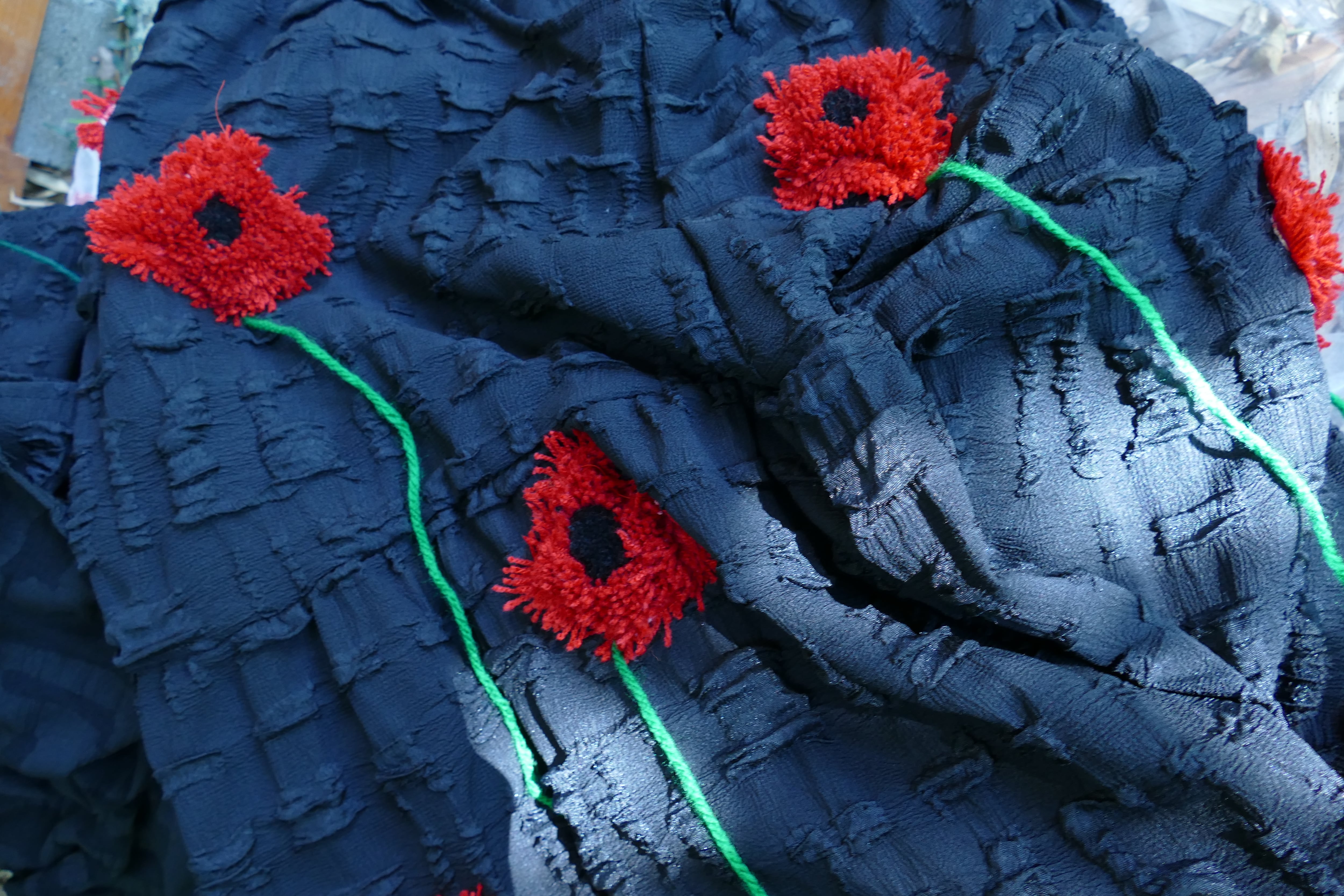 タフティングでひとつひとつ糸を打ち込んで作ったお花のラグワッペンが散りばめられています。