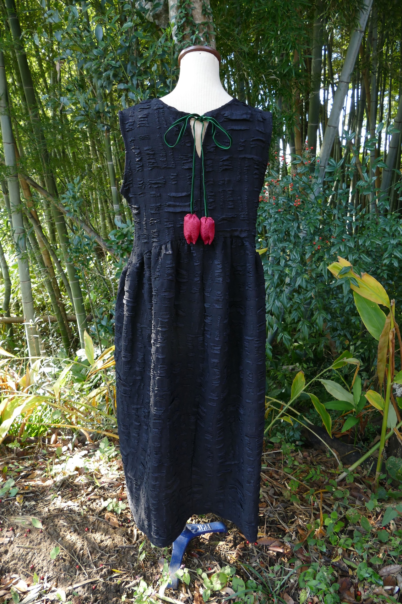 ゆったりとしたシルエットのノースリーブワンピース。バックにチューリップの結び目が付いていて、後ろ姿がとても可愛いです。