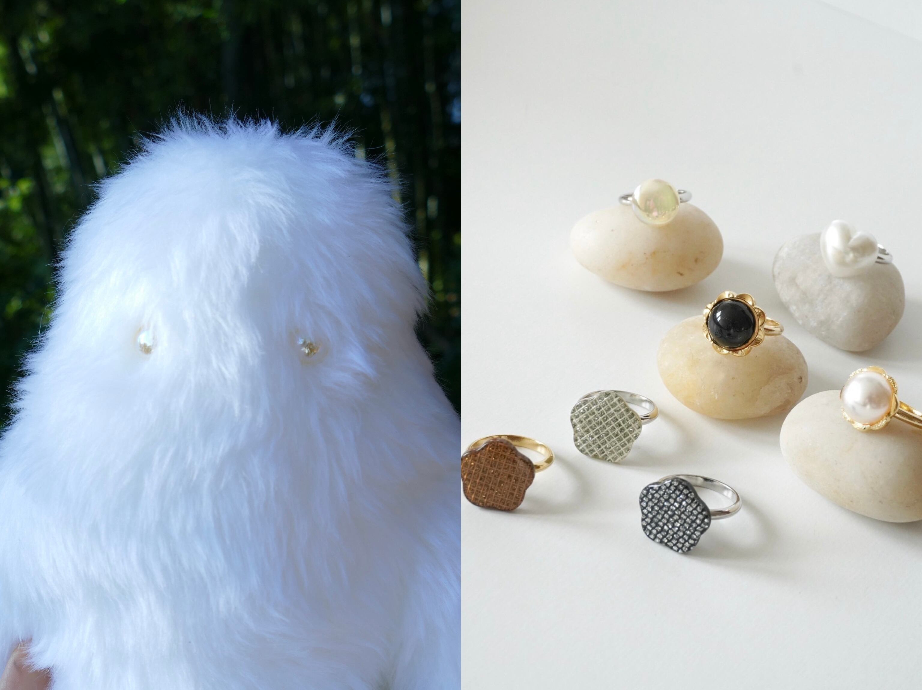 もけもけのぬいぐるみに使用した瞳のボタンで、masco poloがアクセサリーを作ってくれました。