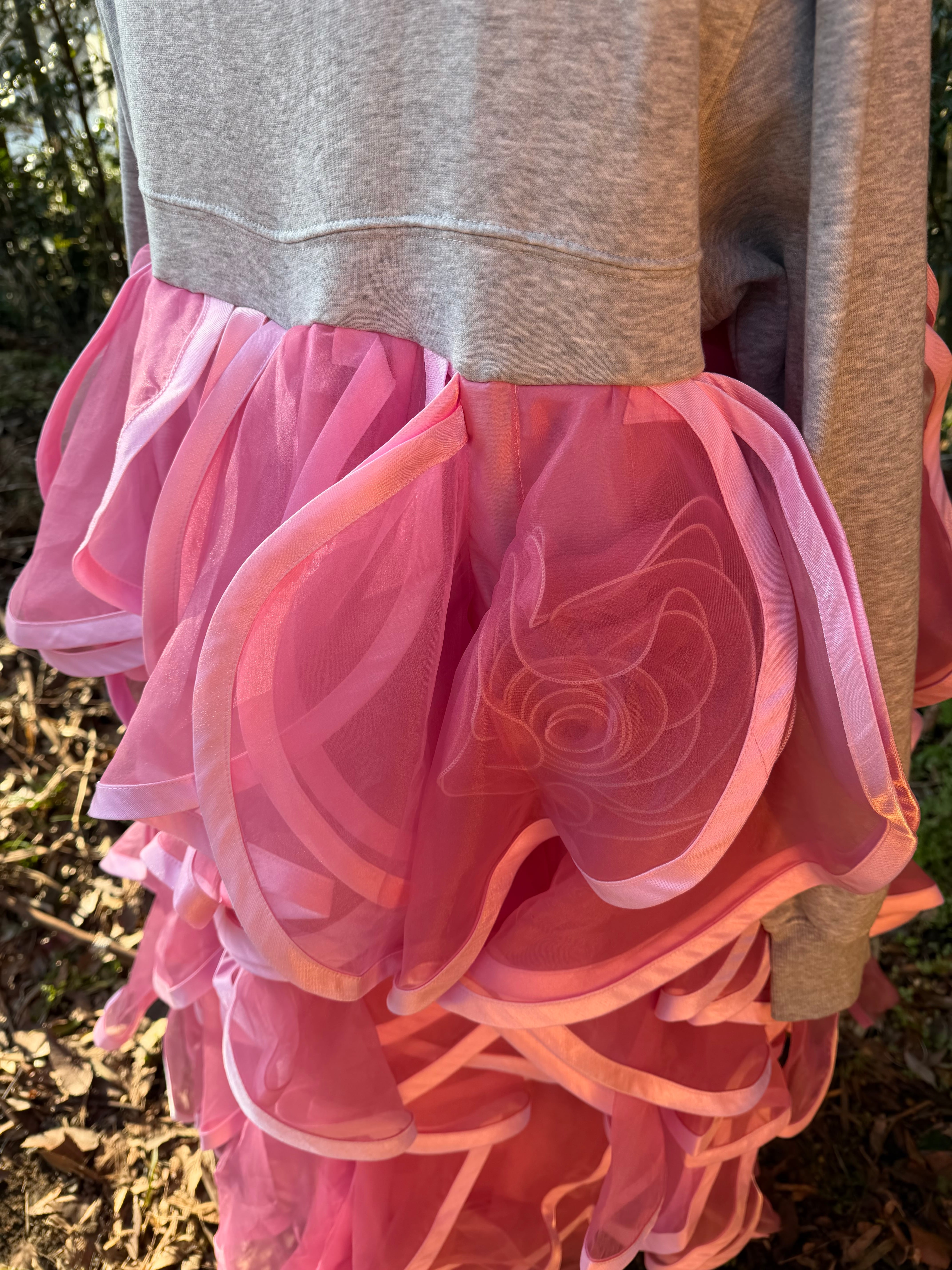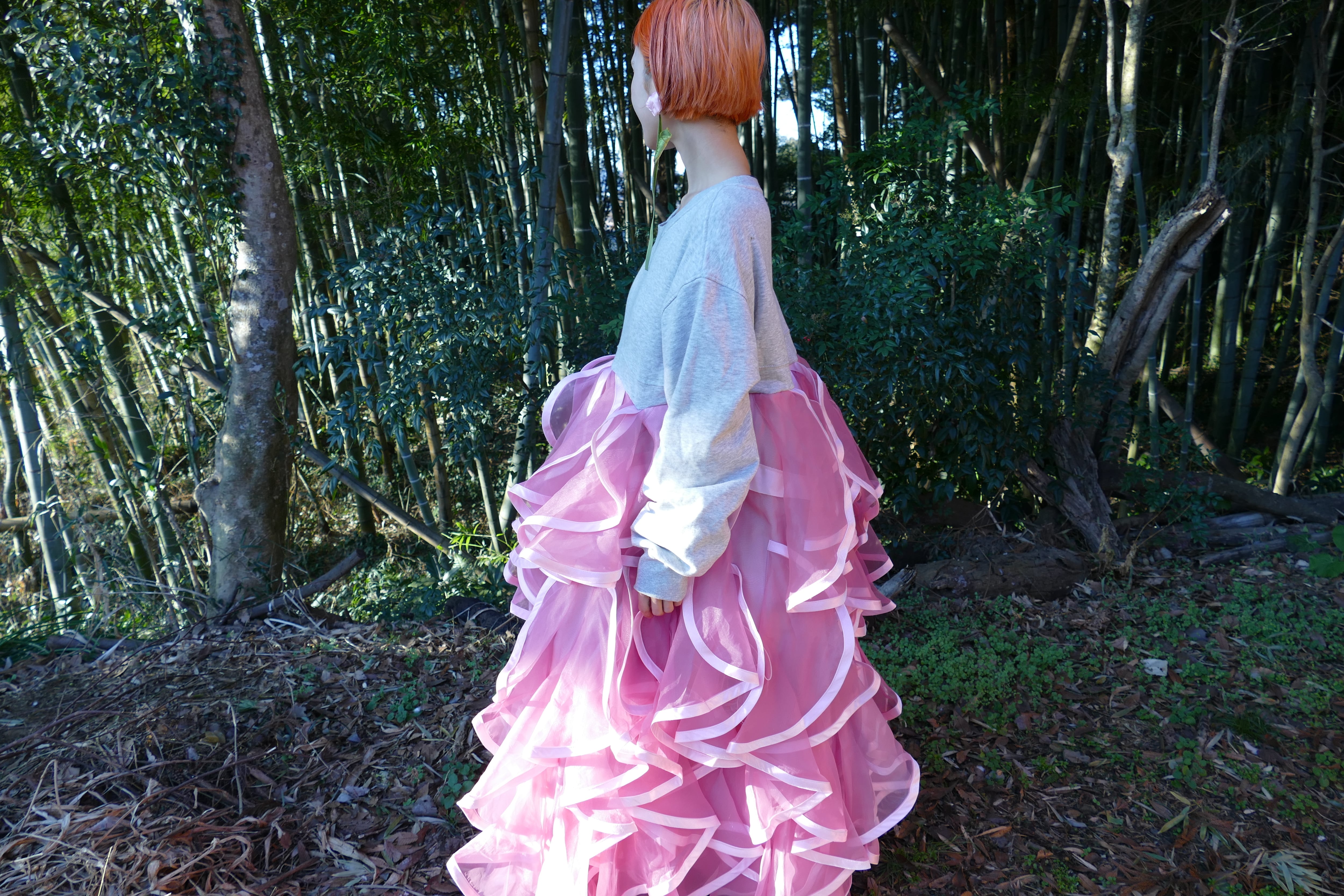 ウエディングドレスのスカート部分を解体、スウェットと組み合わせたワンピース。