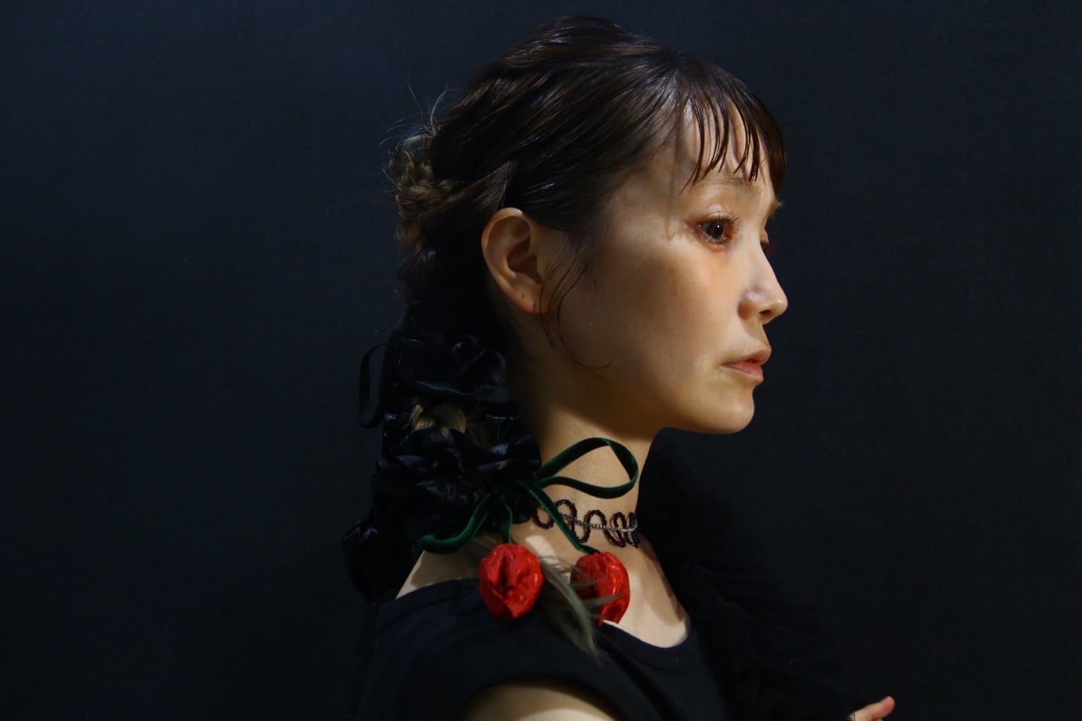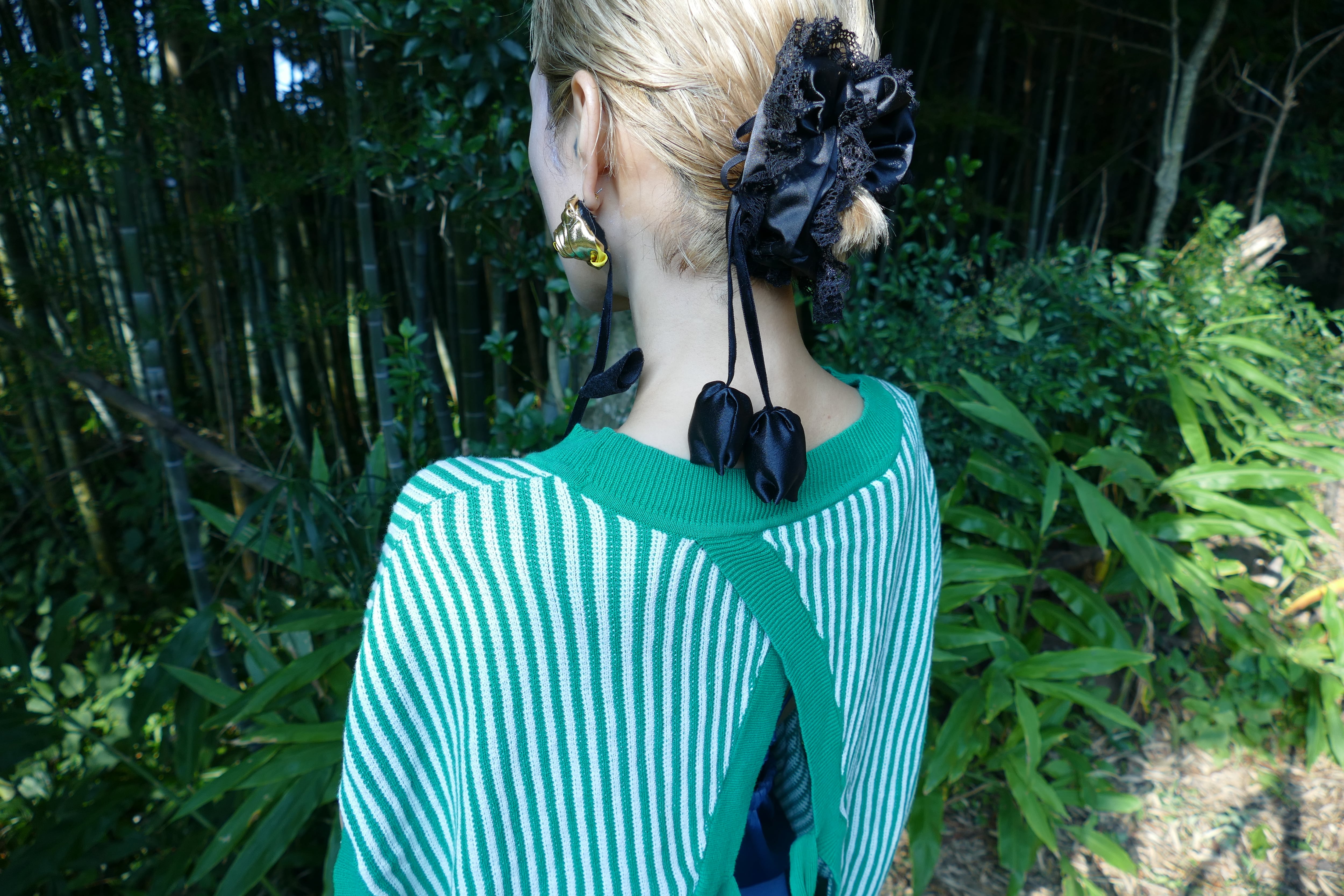 細いベルベットのを茎に見立てており、チューリップが2つ揺れるデザイン。