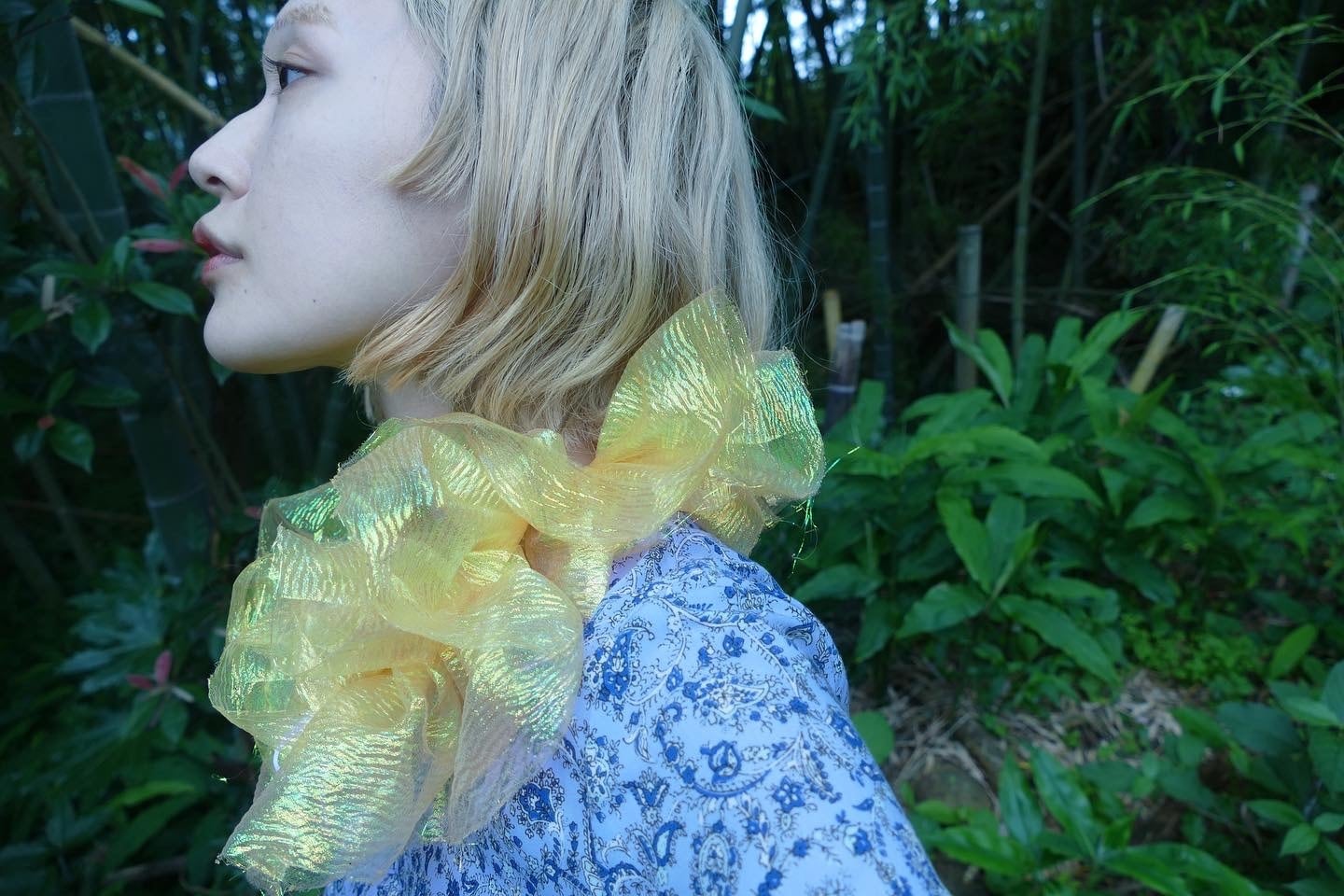 こちらはオーロラに煌めく特殊なサテン生地のハギレを使った付け襟です。