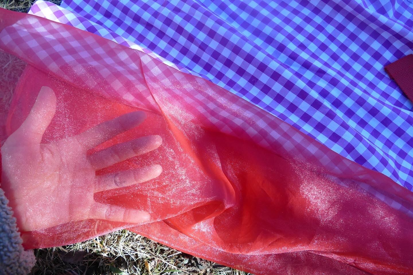 サイドは透け感のある赤のチュール生地。デニムの上に着たり、ワンピースONワンピースで着たりするとおしゃれです。