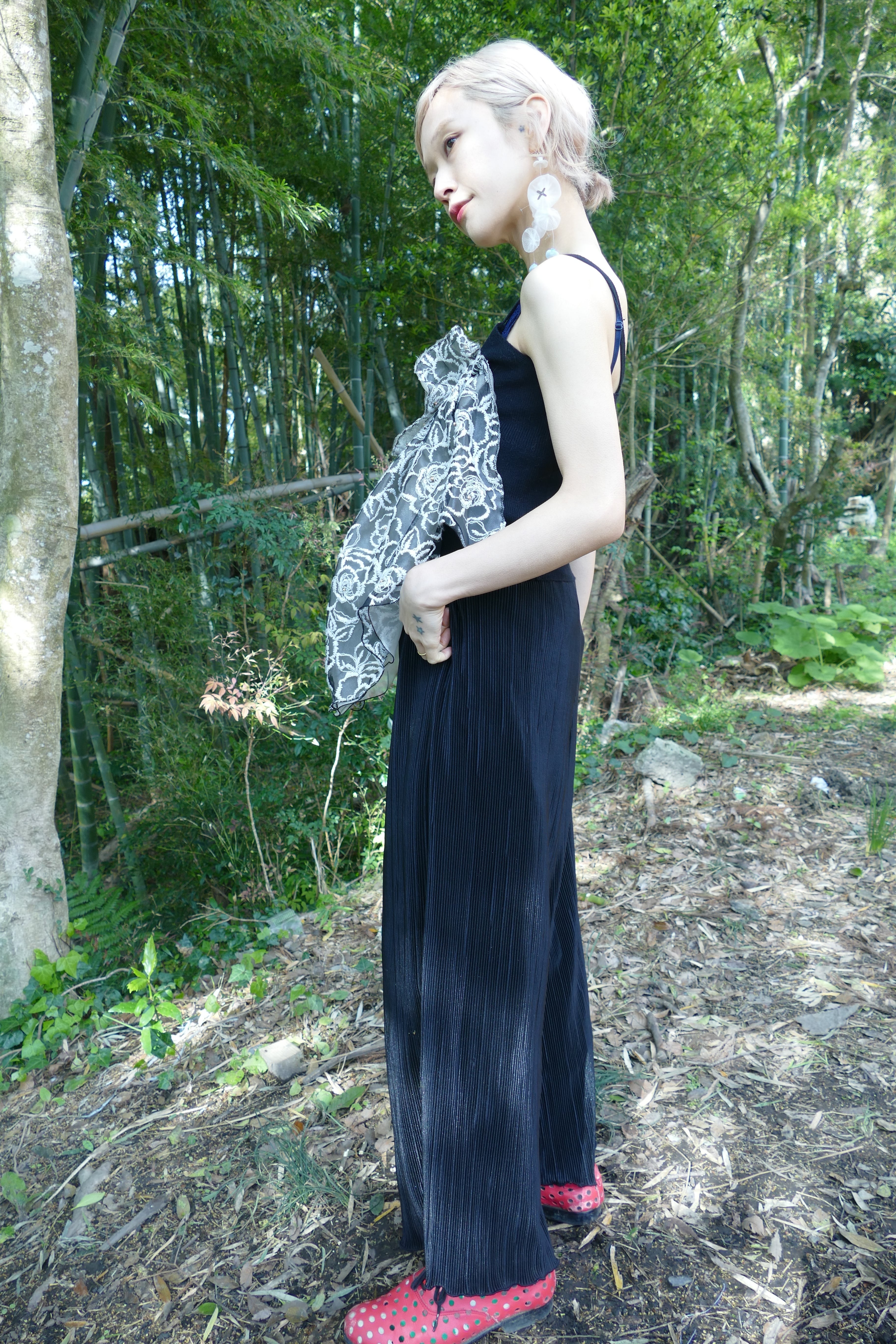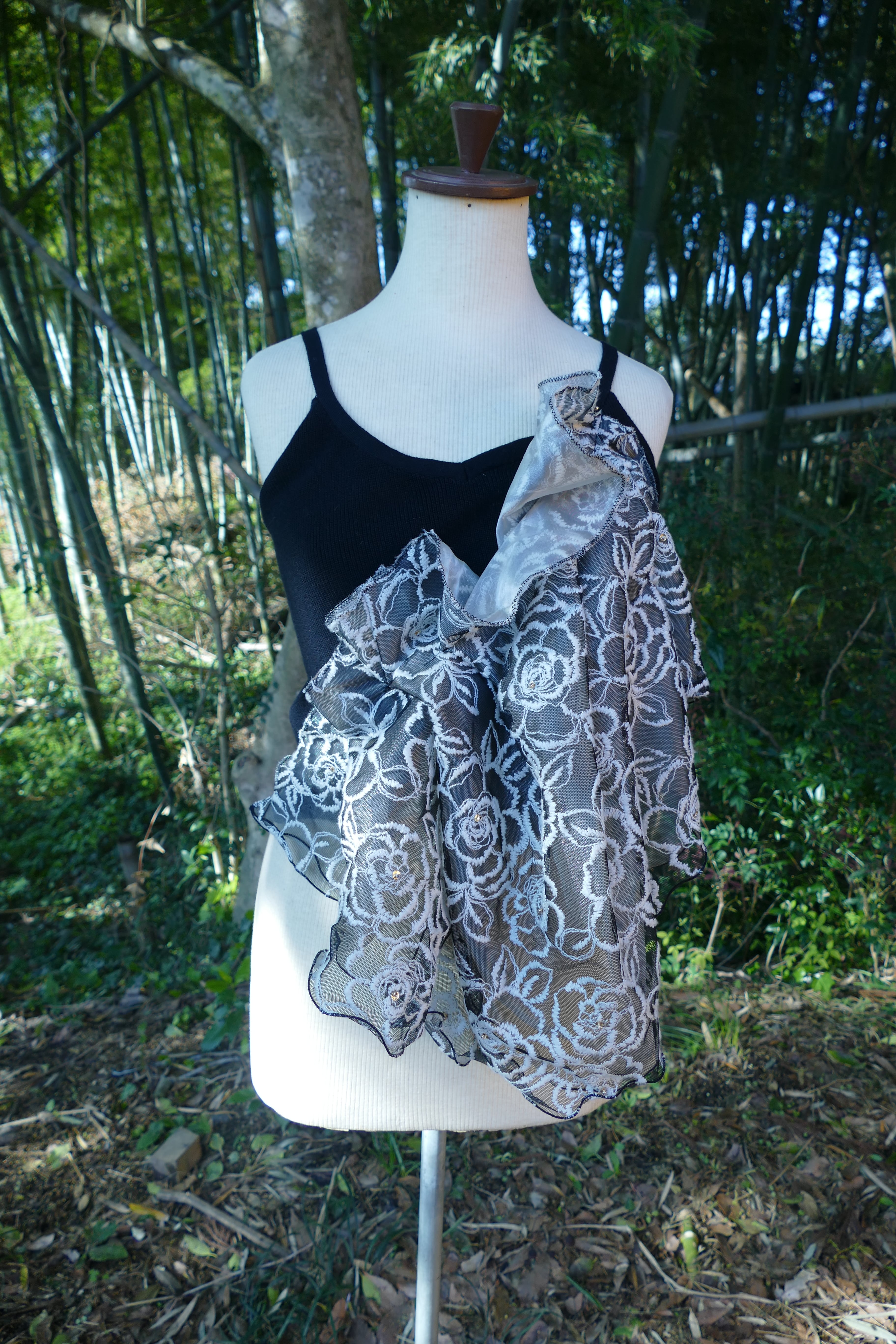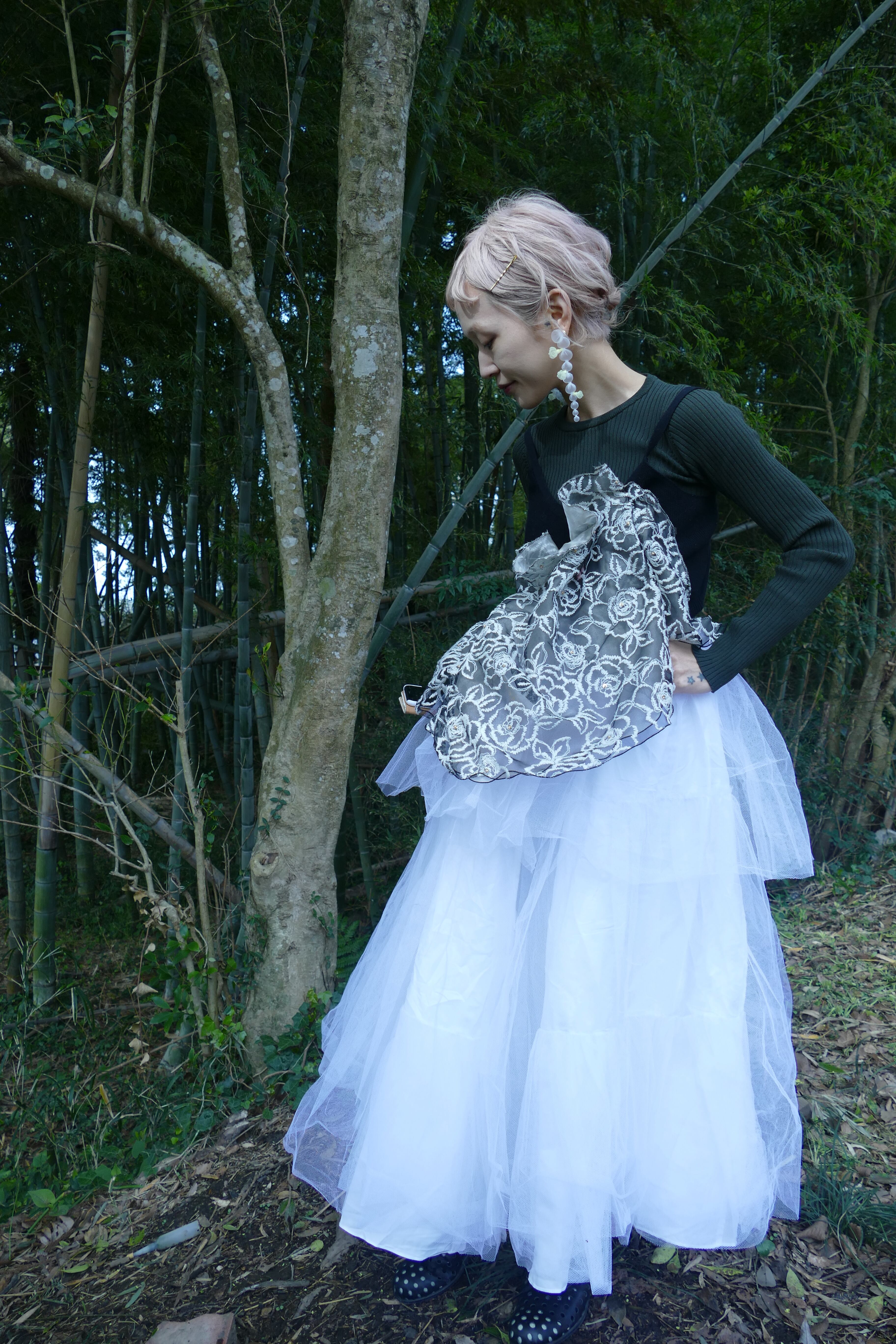 ウエディングドレスのスカート部分を解体し、ニットキャミソールを組み合わせたトップス。