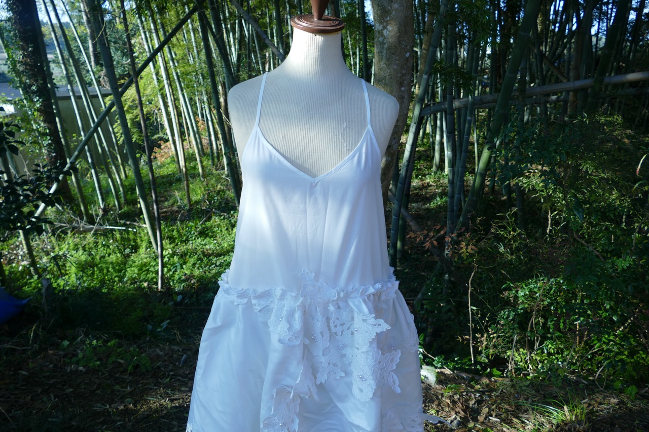 ウエディングドレスのスカート部分を解体し、コットンキャミソールと組み合わせてワンピースに。インナー次第で長いシーズン着回せる一枚です。
